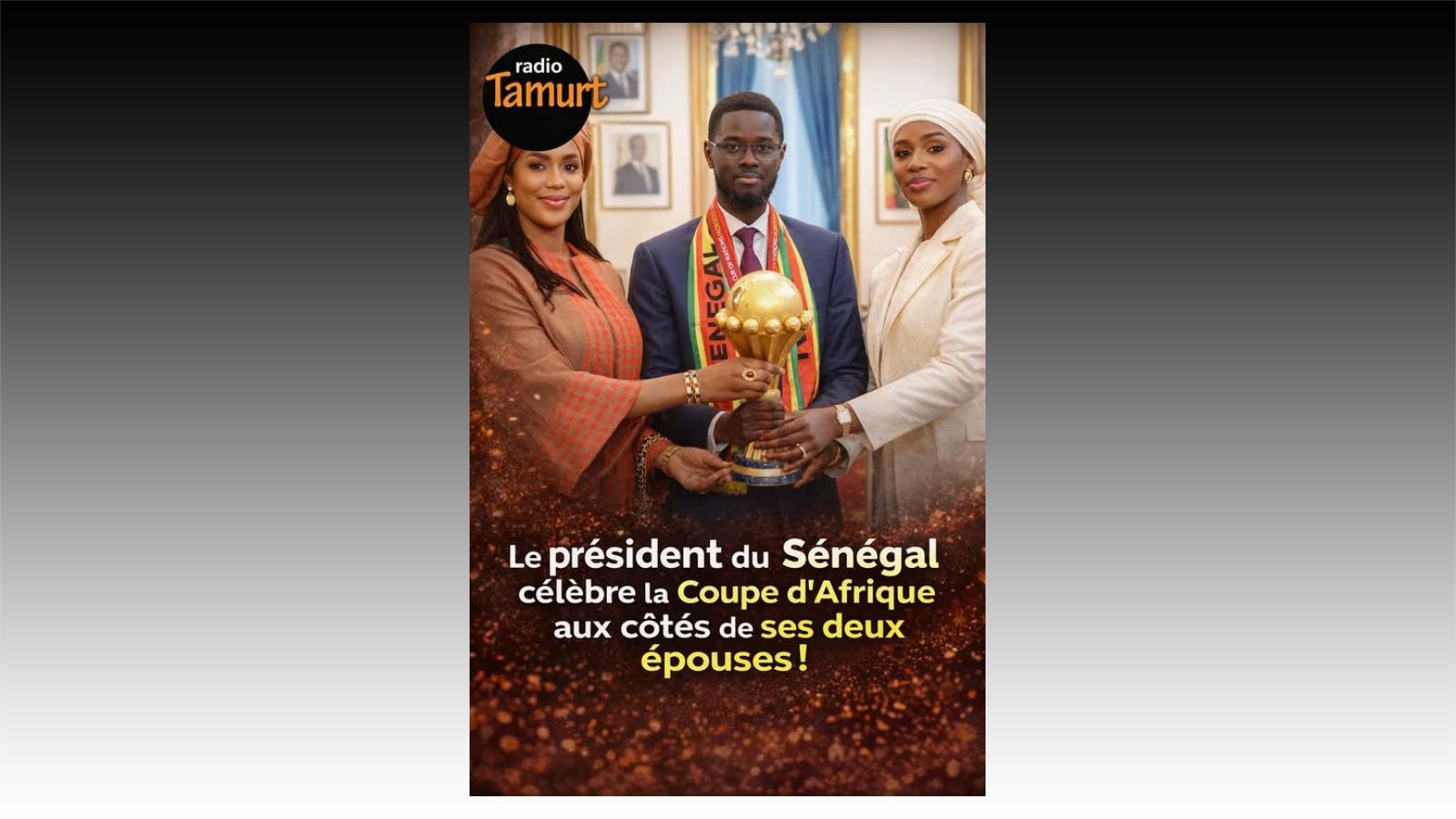 Met-a-manyok (président) Sénégal, Bassirou Diomaye Faye, ka gloriyé (célébrer/to celebrate) zafè péyi'y genyen Koup Foubol l'Afrik ki té ka woulé mwa pasé atè péyi Mawok. I mété an foto déwò épi sé dé madanm-li a éti, okontrè di sa anlo moun ka kwè, i pa mayé épi yo an menm tan. I mayé an primié kou épi pliziè lanné apré i mayé épi an déziem fanm.