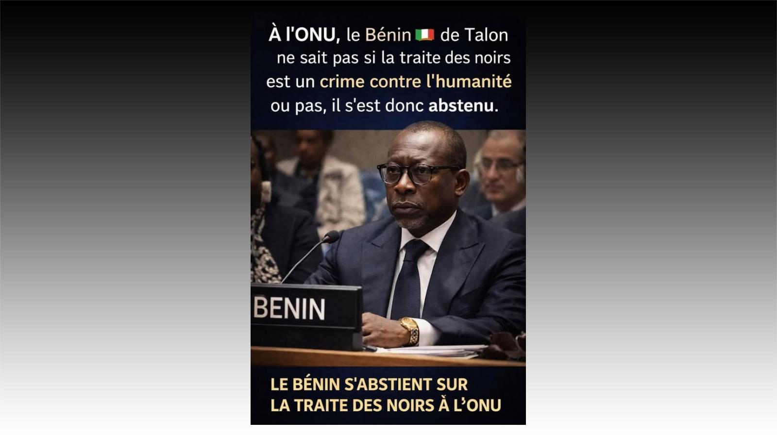 Aujourd'hui, le Bénin S'ABSTIENT lors de la réunion de l'Assemblée générale de l'ONU qui a déclaré que "l'esclavage des Noirs est le plus grand crime contre l'humanité". Il s'abstient exactement comme la France et les autres pays d'Europe de l'Ouest, eux aussi coupables d'esclavagisme pendant 3 siècles. Cela alors que 153 africains, arabes, asiatiques et sud-américains ont voté "OUI" ! Ce vote tout simplement scandaleux, ignoble même, ne devraiit-il pas amener nos Antillais ayant acquis la nationalité béninoise à rendre leur passeport ? Ils ne risquent pas grand chose puisque, comme déjà dit, ils ont conservé la nationalité française. Notre "ambassadeur des Afrodescendants" ne devrait-il pas, lui aussi, présenter sa démission ?