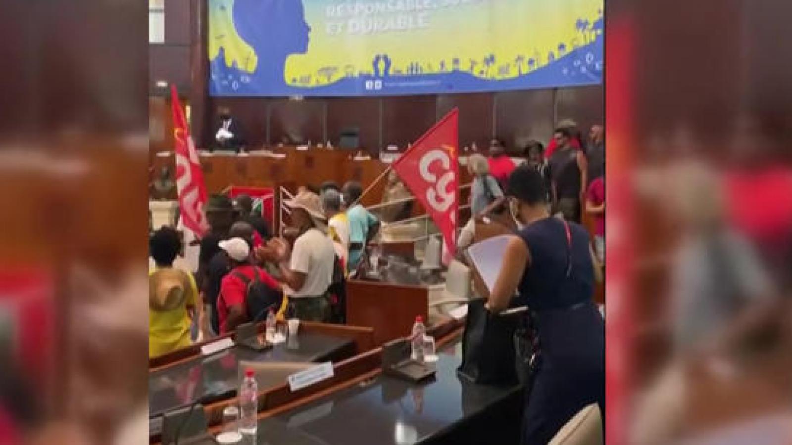 « Le collectif a cassé le portail d’entrée et la porte du hall d’accueil, et ils sont entrés dans l’hémicycle alors que s’achevait une plénière », selon une responsable de la communication à la région. Elle a ajouté que les élus, avertis de leur arrivée, avaient « eu le temps de quitter l’hémicycle » et que le président de la région, Ary Chalus « s’est enfermé dans son bureau ».