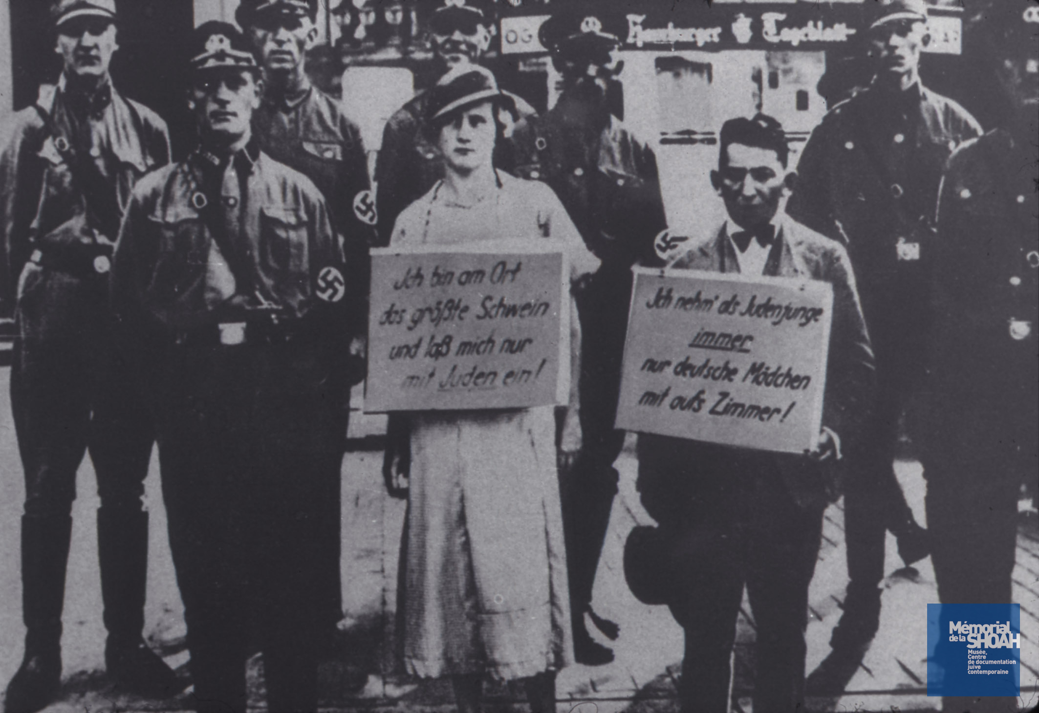Les lois de Nuremberg interdisaient les mariages et les relations sexuelles entre les Juifs et les Allemands non-juifs, et les couples transgressant cette interdiction pouvaient être ainsi stigmatisés afin de servir d’exemple.