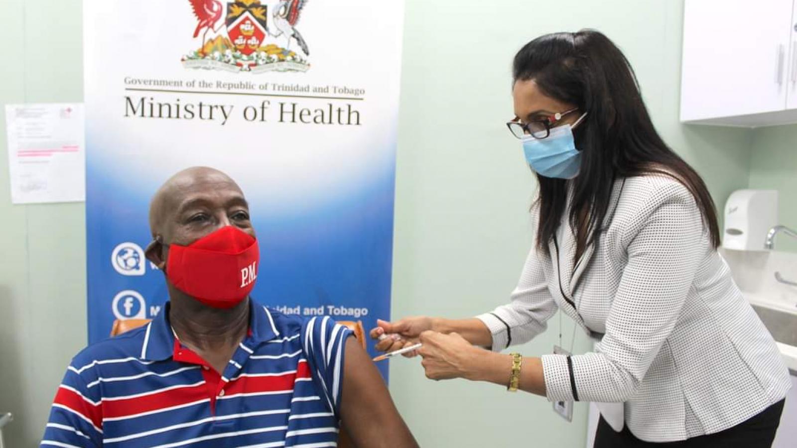 Trinidad-et-Tobago s'est approvisionné à la fois en vaccins à ARN Messager (Pfizer, Astra Zeneca etc.) et en vaccins classiques, notamment le chinois SINOPHARM. C'est ce dernier qu'a choisi le Premier ministre pour se faire vacciner, profitant de l'occasion pour exhorter ses compatriotes à suivre son exemple. Un mois plus tôt, la présidente de la République, Paula-Mae Weekes, s'était déjà faite vacciner (cf. photo plus bas) mais avec le vaccin ASTRA ZENECA qui est à ARN Messager., cela au Grand Stand, Queen's Park Savannah.