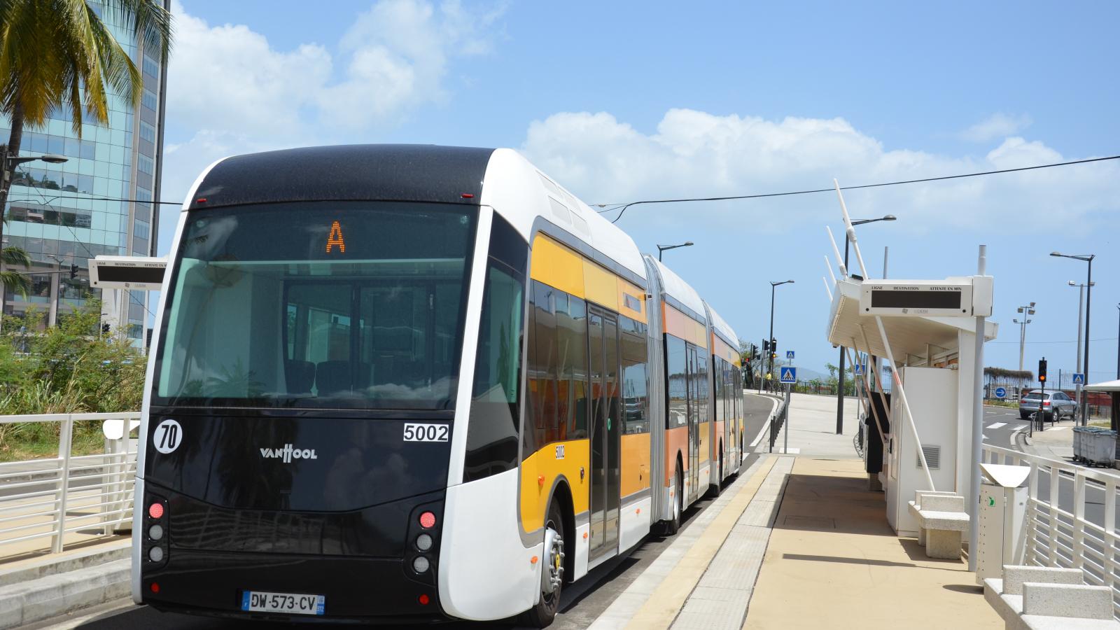 Photo: Arrière du Van Hool ExquiCity 24 n°5002 sur la ligne A du TCSP de Martinique durant la marche à blanc, au terminus de Fort-de-France Almadies par Florian Fèvre. This file is licensed under the Creative Commons Attribution-Share Alike 4.0 International license.