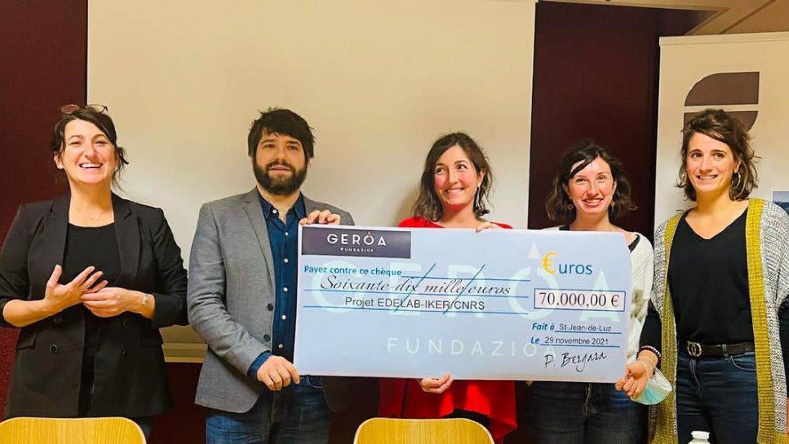 Lundi 29 novembre à Saint-Jean-de-Luz, Claire Lacave et Patxi Bergara, cofondateurs du Fonds de dotation du Pays basque Geroa, ont symboliquement remis un chèque de 70 000 euros aux porteurs du projet de recherche Edelab, pour Évaluation du développement du langage basque et bilingue.