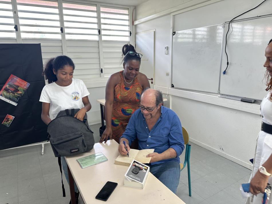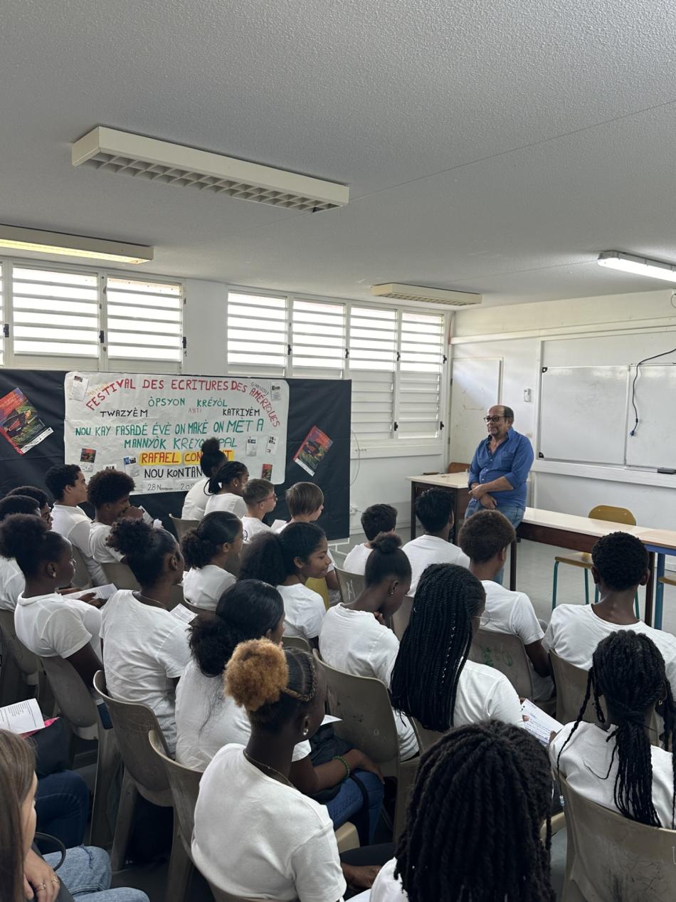 Préparés par leur professeur de Lettres et Option Créole, Mme Livia Peccatus, les élèves ont pu dialoguer pendant près de deux heures avec R. Confiant, l'interrogeant sur ce qui l'a poussé à écrire, sur les thèmes qu'il a choisi de traiter ou encore sur la place de la langue créole dans sa trajectoire littéraire.