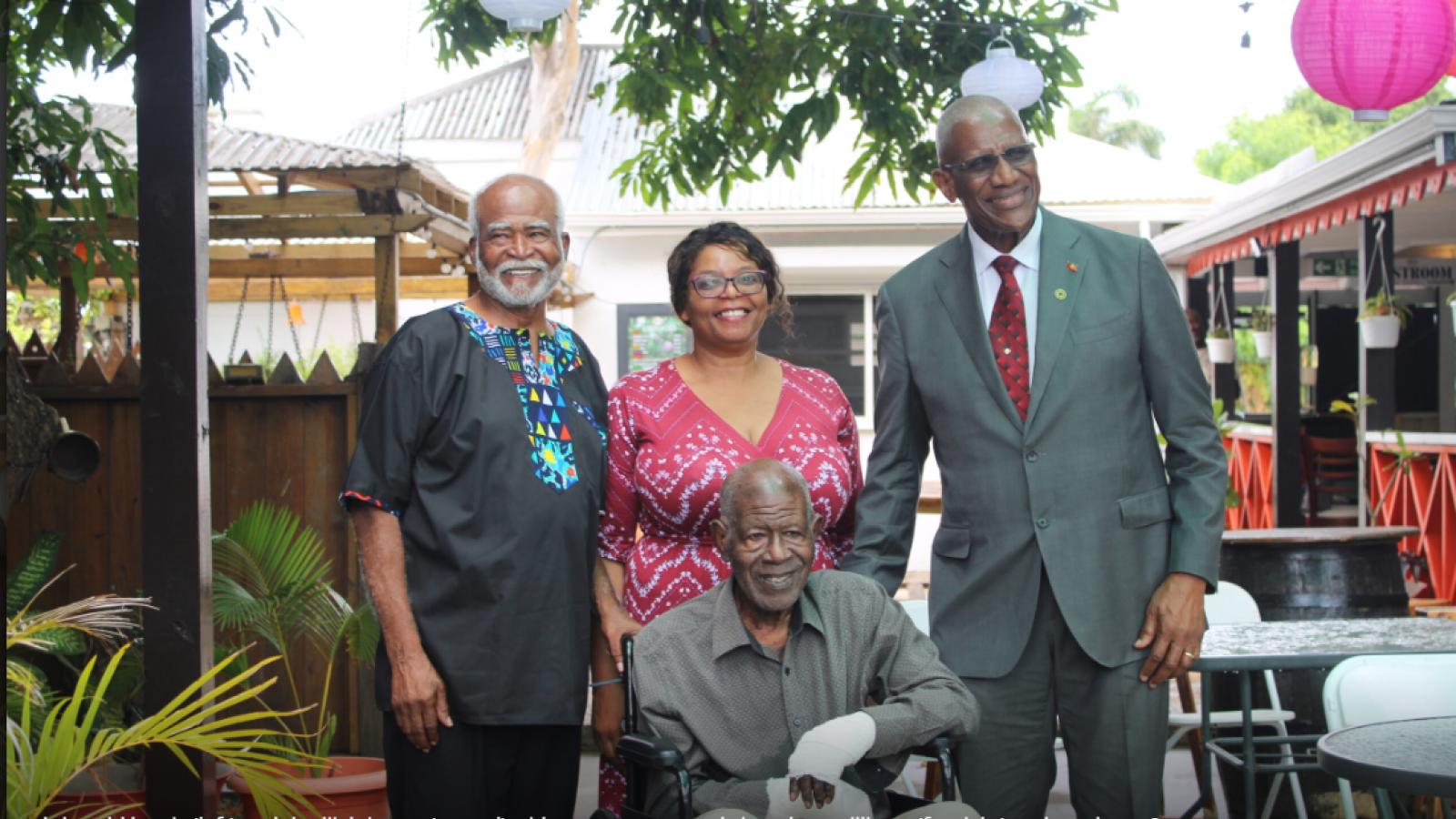 Dr harold harris (left) and dr elijah james (seated) with governor general sir rodney williams (far right) and producer & event coordinator, koren norton during the launch of their new book. jpg