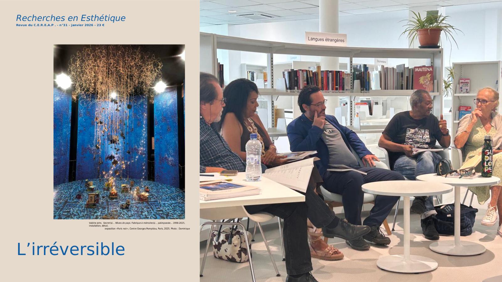 Samedi 18 avril 2026, la médiathèque du Gosier, en Guadeloupe, accueillait le directeur de la revue Recherches en Esthétique, Dominique Berthet, ainsi que quatre auteurs ayant participé à ce numéro sur « L’irréversible » : Christian Bracy, Nikki Élisé, Scarlett Jésus et Guillaume Robillard, devant un public venu découvrir le contenu de ce numéro.