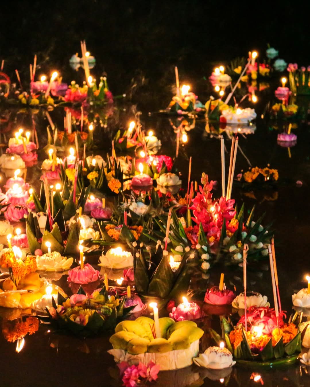 Tout ce qui est fleuve, rivière, klong, lac, étang, mare, étendue liquide brille soudain de centaines de milliers de radeaux en végétal que surmonte une petite flamme, gage d’espoir, promesse de vie.