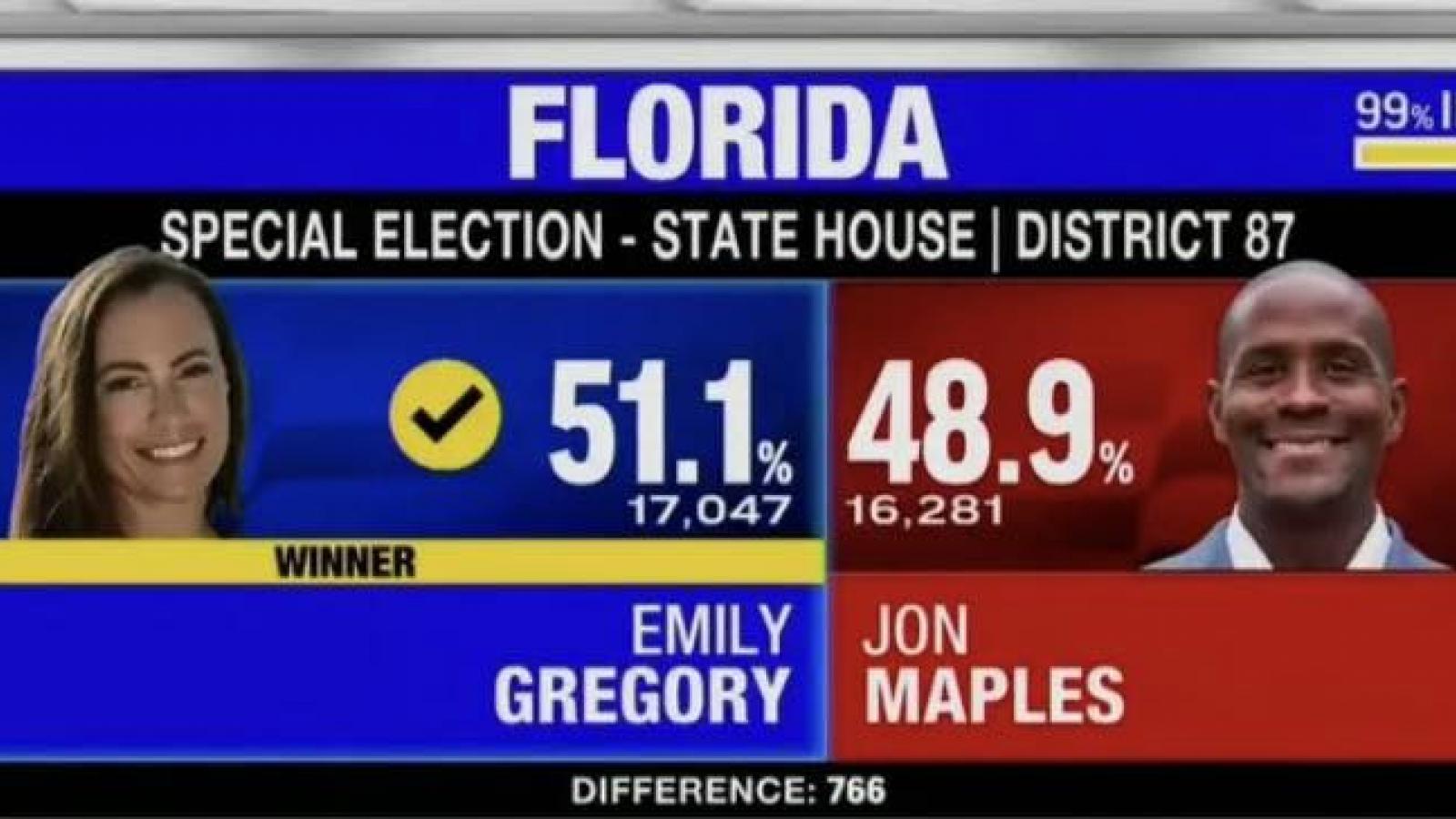 Mais la baffe infligée à Trump hier le concerne personellement : la démocrate Emily Gregory remporte le bastion républicain de Trump de Mar-A-Lago et remporte l’élection partielle dans le 87e district, battant le républicain Jon Maples soutenu par Trump.