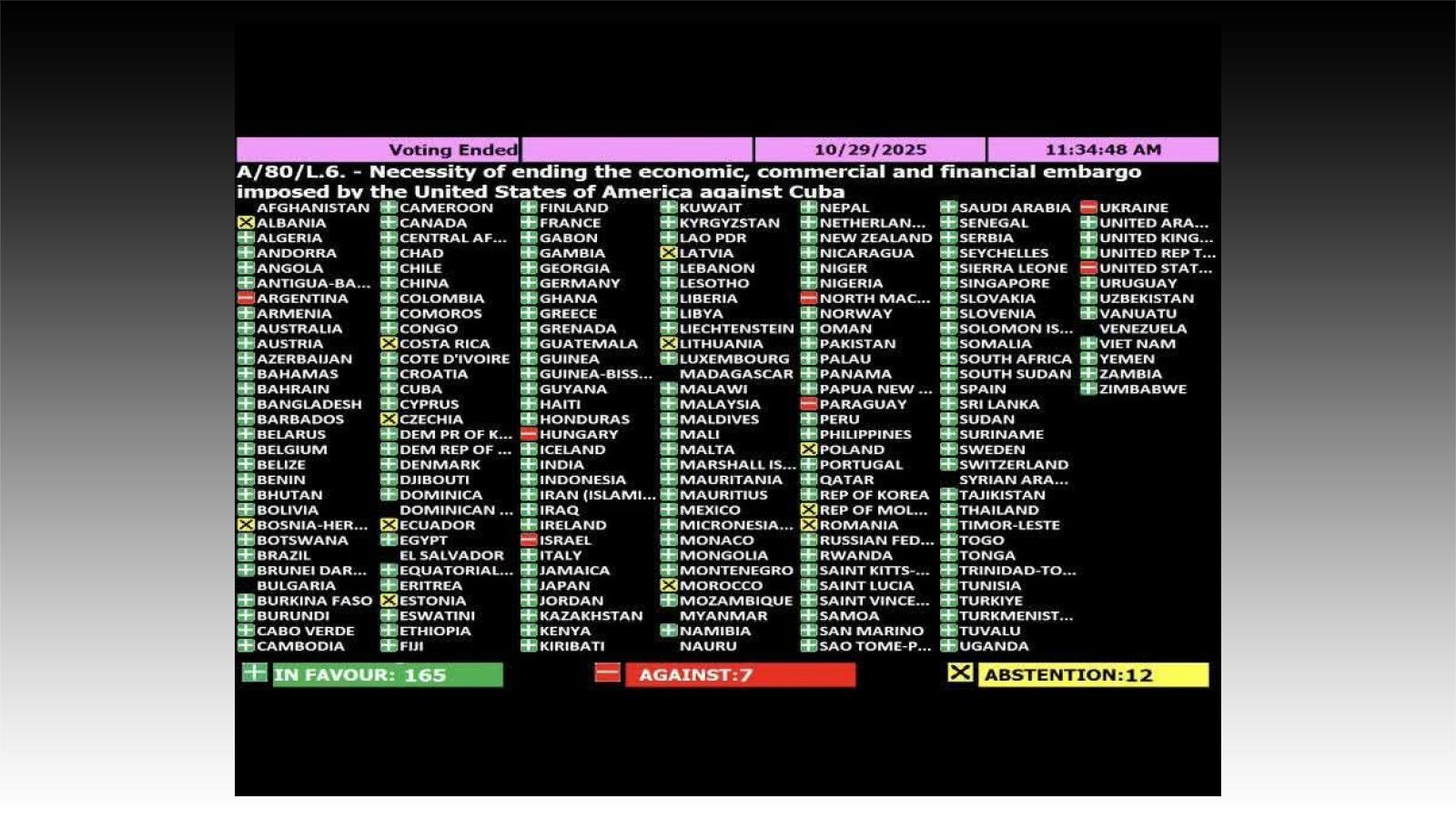Pour la 33ème fois, presque le monde entier a rejeté le blocus américain contre Cuba. À l'Assemblée générale des Nations Unies, 165 pays ont voté pour une résolution demandant la fin du blocus économique, financier et commercial meurtrier par lequel les États-Unis tentent d'étouffer le socialisme cubain depuis plus de 60 ans.